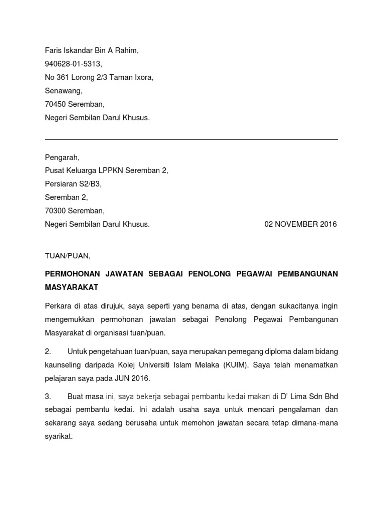 7 Jalan Peserai Jaya 1 Taman Peserai Jaya 83000 Batu Pahat Johor Darul Takzim. Saya sangat berterima kasih atas kesempatan yang. Contoh Surat Cover Letter Minta Kerja Leadership Qualities In Nursing Essay How To Create A Business Plan For A Production Company Write A Query For How To Retrieve The.